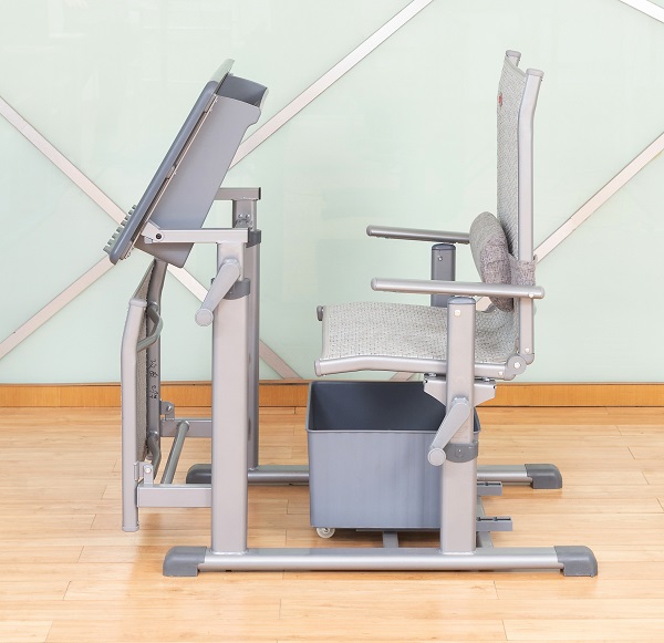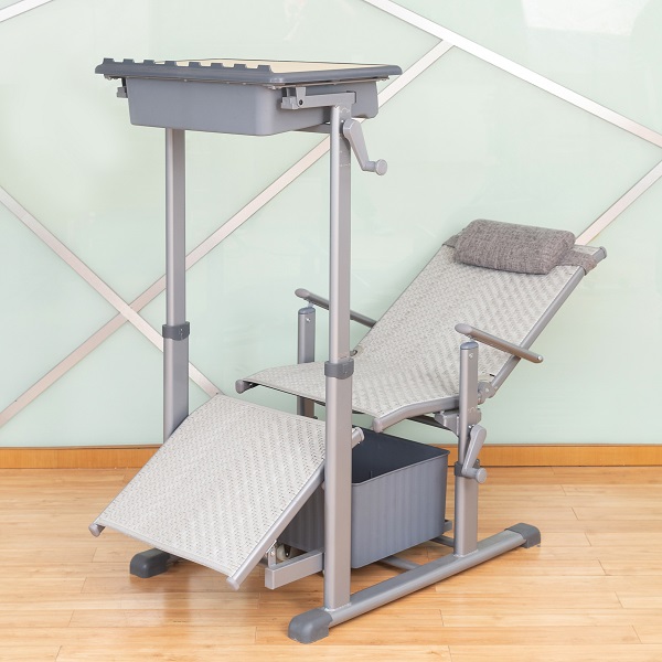 4、課椅規(guī)格及材料:460mm*380mm*(座椅面高420mm-460mm可手搖升降調(diào)節(jié))±5mm,椅背可調(diào)最大傾斜度150°。座靠面料采用符合出口標(biāo)準(zhǔn),沖擊100KG,靜壓180KG,60分鐘無損,抗紫外線不褪色,使用壽命8年以上的環(huán)保PE藤條。藤條規(guī)格為寬7.5mm±0.05mm*厚1.2mm±0.02mm,滕面邊沿采用PE材料包邊,尼龍線縫紉固定工藝。椅下設(shè)置370*330*190mm±3mm的PP材料的貯物箱,貯物箱底下前部設(shè)置雙滑輪,后部設(shè)置滑塊,與課椅下雙滑軌(ABS材質(zhì),規(guī)格315*30*20mm)的卡位裝置結(jié)構(gòu)配合,貯物箱可前后自由限位滑動,可脫卸。