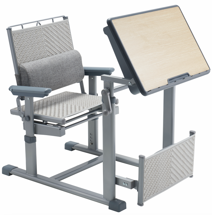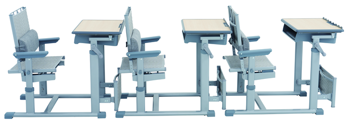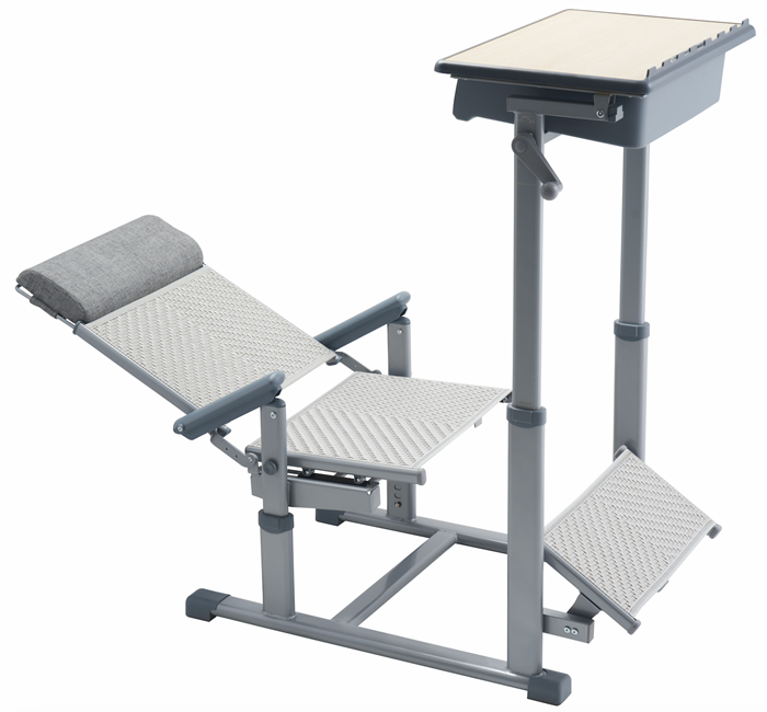 7、課桌椅午休模式:課桌通過單側(cè)手搖桿升高到午休高度,課椅靠背后仰,并打開PE藤質(zhì)擱腳板,借助桌下和椅下空間,可在0.88米前后間距實(shí)現(xiàn)150度原位舒適躺休。