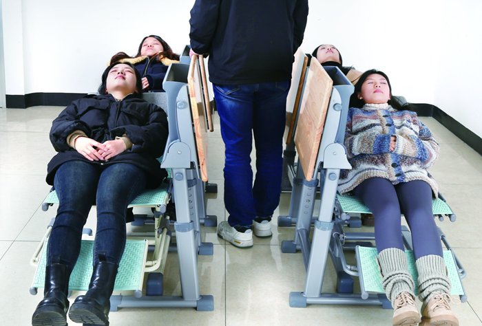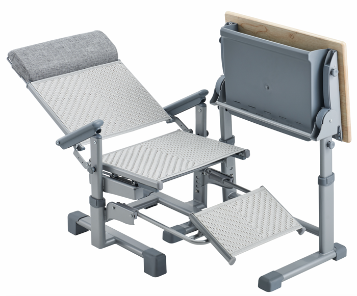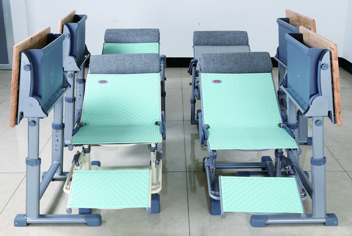 6、課桌椅午休模式:將課桌面板和桌斗通過按鍵變形成垂直模式,將課桌移到課椅側(cè)面,并將一側(cè)桌腳插入椅腳條和地面的空隙里,插入后整套課桌椅的左右占地尺寸在700mm以內(nèi),更好地騰出教室通道空間。課椅底部保持原位,課椅靠背后仰至150度躺椅模式,課椅座面下方水平移出U型腳托支架,支架上設(shè)置PE塑料材質(zhì)的擱腿板,翻轉(zhuǎn)即可進(jìn)行使用,可在0.88米前后間距實(shí)現(xiàn)150度原位舒適躺休。
