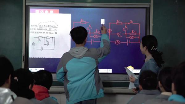 于是呂老師利用信息化教學(xué)應(yīng)用工具做了一個(gè)極簡(jiǎn)的課堂講解,她在智能平板一體機(jī)上畫出例題中的電路圖,利用信息化教學(xué)應(yīng)用工具的點(diǎn)名功能隨機(jī)抽取學(xué)生上臺(tái),繼而以讀題的方式,在旁邊引導(dǎo)學(xué)生利用筆和橡皮擦工具化動(dòng)態(tài)電路為靜態(tài)電路:“電路閉合后,沒(méi)有電流通過(guò)的地方,請(qǐng)你擦掉去”。