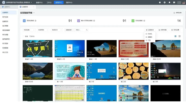 該學(xué)校擁有3個(gè)校區(qū)、100余間多媒體教室,教室內(nèi)多媒體教學(xué)設(shè)備一旦出現(xiàn)異常,電教管理老師要到教室才能解決,后期設(shè)備維護(hù)壓力大。接入希沃魔方·數(shù)字基座后,老師通過(guò)設(shè)備管理應(yīng)用,遠(yuǎn)程就可以操作一鍵關(guān)機(jī)、一鍵鎖屏等指令;針對(duì)要統(tǒng)一安裝的文件,也無(wú)需到教室中逐一安裝,系統(tǒng)支持一鍵靜默安裝,既不影響正常上課秩序,又能提升設(shè)維效率。