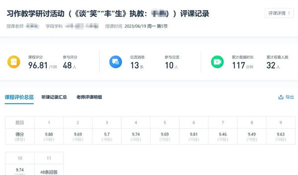 以聽(tīng)課評(píng)課為例,南校區(qū)的老師在希沃魔方上發(fā)起聽(tīng)課評(píng)課,兩個(gè)校區(qū)的老師可通過(guò)二維碼或鏈接進(jìn)入群內(nèi),在線觀看公開(kāi)課,在課后還能通過(guò)科學(xué)的評(píng)分表進(jìn)行反饋。目前,惠州市第十一小學(xué)累計(jì)產(chǎn)生線上化教研交流研討近800次。