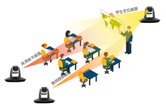 支持多路攝像的跟蹤定位拍攝,分別對應教師區(qū)、學生區(qū)以及板書區(qū);支持階梯教室跟蹤,不會因為前后座位高度的差異導致跟蹤混亂。