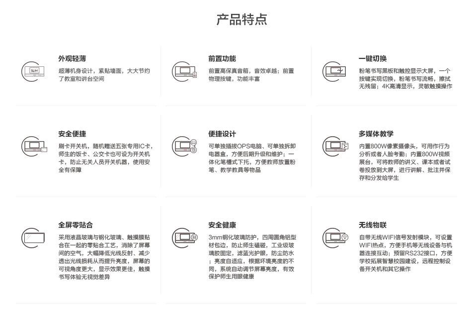 文香超薄智慧黑板在不改變教師使用習(xí)慣的基礎(chǔ)上實現(xiàn)了傳統(tǒng)黑板教學(xué)與多媒體智慧教學(xué)之間的無縫切換。高清顯示,高亮設(shè)計,超薄機身,最高支持4K分辨率。超薄智慧黑板采用刷卡開關(guān)機,提高了設(shè)備使用的安全性;鋼化玻璃采用的是超薄防眩光鋼化玻璃,慮光護眼,健康防塵,安全無銳角;增加了感光模塊,根據(jù)使用的環(huán)境中的光的亮度自動調(diào)節(jié)屏幕亮度;插拔式電腦OPS和電器模塊便于安裝和維護。黑板下方一體化筆槽,教師可將粉筆等放置其中。內(nèi)置視頻展臺(高拍儀)和攝像頭。