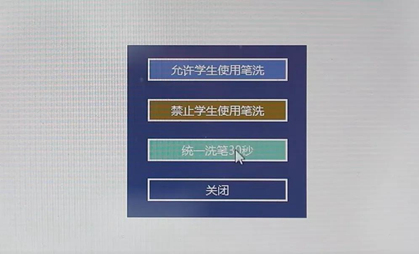 在華文眾合智慧書法教室系統(tǒng)界面,鼠標(biāo)上移至屏幕頂端任意位置,會(huì)出現(xiàn)一排快捷菜單,點(diǎn)擊筆洗,會(huì)彈出筆洗功能菜單,點(diǎn)擊【統(tǒng)一洗筆30秒】,學(xué)生端的筆洗器就會(huì)出水30秒。這時(shí)候可以讓學(xué)生進(jìn)行洗筆或潤(rùn)筆的操作。出水30秒后會(huì)自動(dòng)停水。