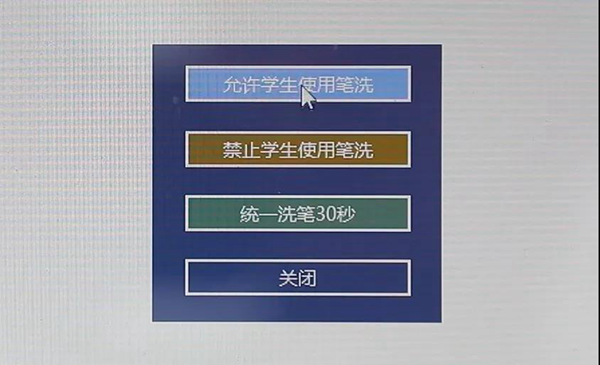 在筆洗功能菜單中點(diǎn)擊【禁止學(xué)生使用筆洗】,學(xué)生端的筆洗控制按鈕會(huì)自動(dòng)消失,這樣就收回學(xué)生洗筆權(quán)限。課堂盡在老師掌握。