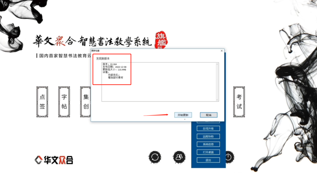 若學(xué)校軟件長(zhǎng)期沒(méi)有進(jìn)行升級(jí)更新完成后可以看到書法系統(tǒng)界面會(huì)有略微變化