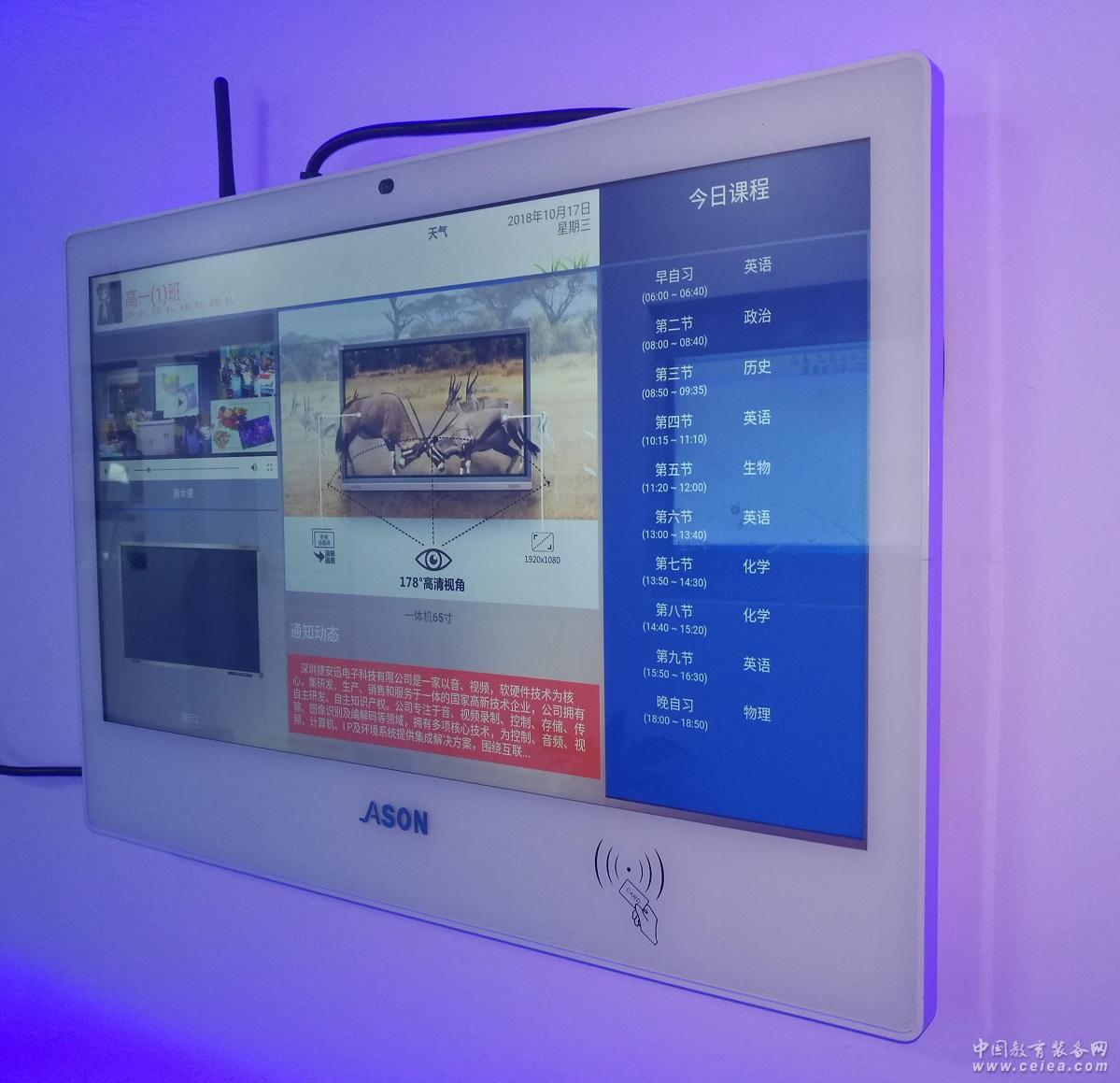 尺寸:21.5” 顯示區(qū)域:47.6cmX26.8cm (V) 點(diǎn)距:0.08275 mm x 0.24825 mm 最佳分辨率:1920*1080RGB 顯示比例:16:9 亮度:3 450cd/㎡ 對(duì)比度:1000:1(Typ.)透射 亮度均勻性>70%;響應(yīng)時(shí)間6.0ms;顯示色彩8 bit/16.7 Billion 背光源:LED;屏壽命:3 50000 小時(shí) 系統(tǒng)3188 瑞芯微;RAM2G;內(nèi)存8G;WIFI:可選配;接口:SB*2/RJ45*1/SD*1/VGA*1/HDMI*1 操作系統(tǒng):2017/3/27 電子:喇叭2x5W;供電:DC:12V2.5A(電源內(nèi)置) 看門狗:死機(jī)后自動(dòng)重啟;電容屏:10 點(diǎn);攝像頭:200W,可視角 88 度以上 讀卡器:頻率:13.56MHz;支持 IC 射頻卡 整機(jī)外觀:表面鋼化玻璃、邊框型材、標(biāo)準(zhǔn)壁掛架帶;防盜、后殼散熱設(shè)計(jì)。 --------------------------------------------- 隨著教育信息化建設(shè)的不斷深入,在教育行業(yè)推行全面信息化改革的驅(qū)動(dòng)下,電子班牌作為一個(gè)連接學(xué)生與班級(jí)學(xué)校的優(yōu)良載體,能極大的增強(qiáng)教學(xué)雙方的信息互動(dòng),高效便捷的傳遞各種知識(shí)及通知信息,實(shí)現(xiàn)班級(jí)學(xué)校與學(xué)生之間的無縫交流。 捷安迅電子班牌在繼承了傳統(tǒng)班牌的優(yōu)勢(shì)下,對(duì)班牌界面和信息顯示做了深入的優(yōu)化,通過班牌,可方便快捷的了解班級(jí)、班級(jí)相冊(cè)、天氣、校園節(jié)目、通知?jiǎng)討B(tài)、今日課程等相關(guān)信息。讓學(xué)生一目了然,極大的拓寬了校園信息化的技術(shù)環(huán)境。同時(shí)使班級(jí)、校園文化建設(shè)更加生動(dòng)具體。 系統(tǒng)組成: 使用場(chǎng)景:校內(nèi)