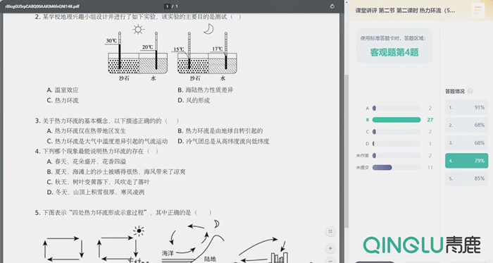 本節(jié)課圍繞重難點內(nèi)容,張老師借助直觀的科學(xué)實驗視頻、圖片材料呈現(xiàn)相關(guān)知識,引導(dǎo)學(xué)生主動探究與互動分享,并結(jié)合實際生活案例讓學(xué)生借助所學(xué)知識達到問題解決的目標(biāo);在學(xué)習(xí)反饋方面,師生借助青鹿智慧紙筆系統(tǒng)完成知識檢測,且通過作答數(shù)據(jù)的即時分析與反饋,展開針對性講解并靈活調(diào)整課堂教學(xué)進度,有效提升了教學(xué)效率。