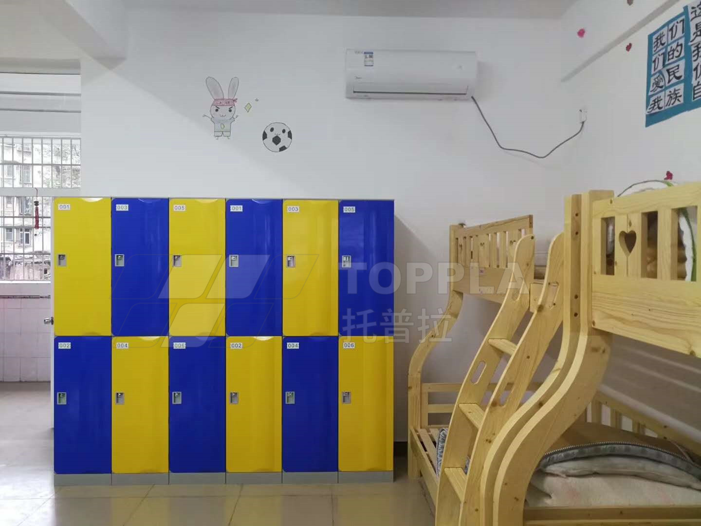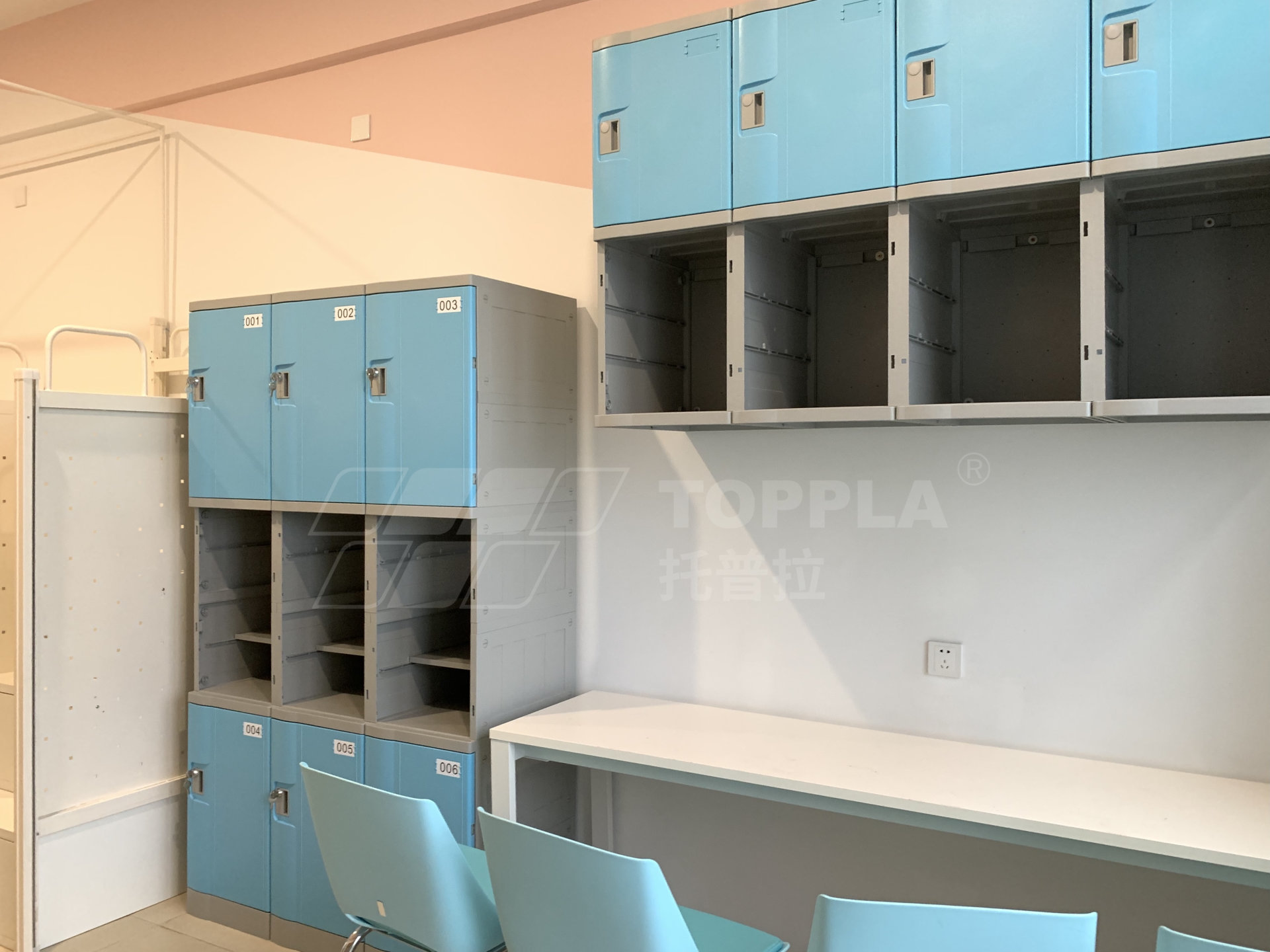由于空間限制,在宿舍內落地放置了3門3列的儲物柜之后,已無法容下其他收納柜,托普拉在空間局限的條件下,合理利用書桌上方空間,將儲物柜安裝于墻上,即不占用地面面積,又增加了宿舍內的儲存空間,一舉兩得。