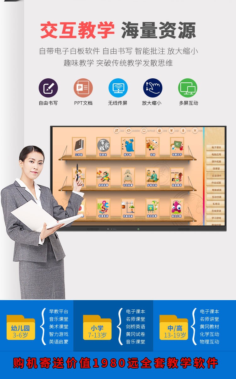 產(chǎn)品功能優(yōu)勢 1、雙系統(tǒng)Windows/Android,一鍵切換; 2、海量教學(xué)資源,從幼兒園到大學(xué)應(yīng)有盡有,滿足多元化教學(xué)需求; 3、六合一,強(qiáng)勁功能,集投影儀、幕布、電腦、電子白板、平板、音響于一體; 4、教學(xué)應(yīng)用,興趣教學(xué)。逼真貼近教學(xué)應(yīng)用,電子教學(xué)上課更輕松; 5、智能批注,未來教學(xué), 解決教學(xué)問題,讓你更輕松; 6、多人同屏,輕松互動,傳屏雙向操作,擁有教學(xué)會議多人同屏功能; 7、掃碼帶走,課件下載,手機(jī)掃一掃課件二維碼,輕松把它帶回家; 8、無線投屏,教學(xué)更輕松,互動更頻繁; |