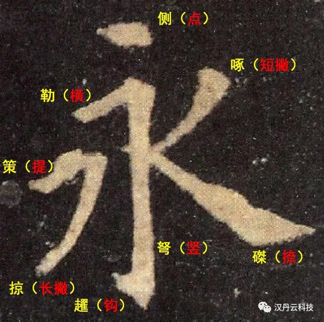永字八法就是“永”這個字的八個筆畫,分別是側(cè)、勒、弩、趯、策、掠、啄、磔共八畫,以諸宗元所著《中國書學(xué)淺說》一書中解說較為明了。
