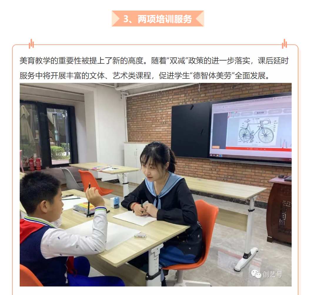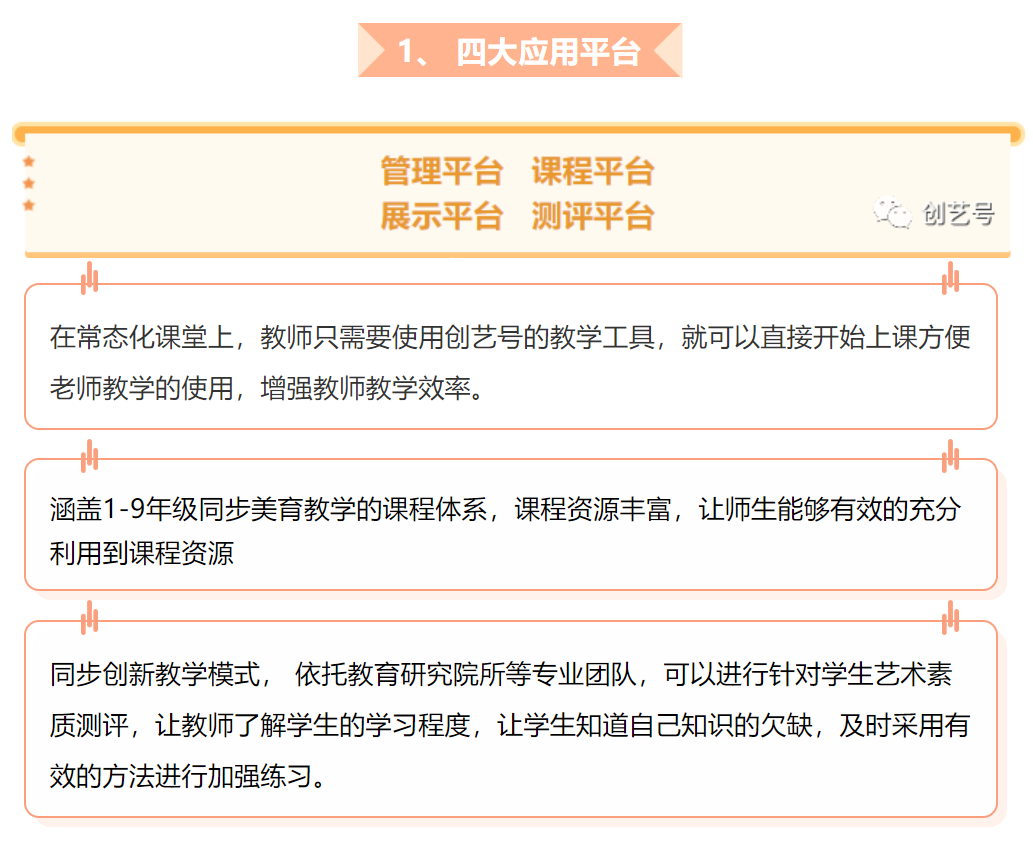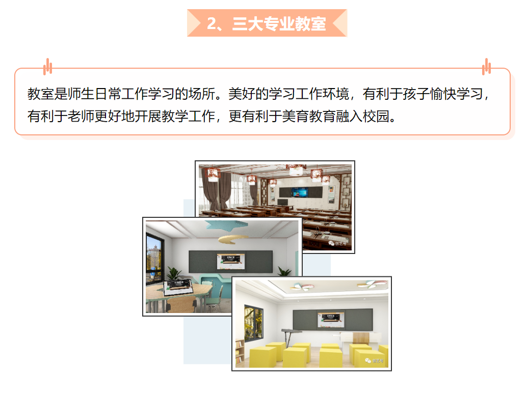 區(qū)域美育整體解決方案。創(chuàng)藝號美育綜合建設方案,做到“三建設,三提升”,建設美育創(chuàng)新型課程模式,提升區(qū)域整體教學能力;建設美育發(fā)展性評價體系,提升學生藝術綜合素養(yǎng);建設美育專業(yè)化場地課程,提升學校優(yōu)質(zhì)特色發(fā)展,有效服務美育進校園、進中考。