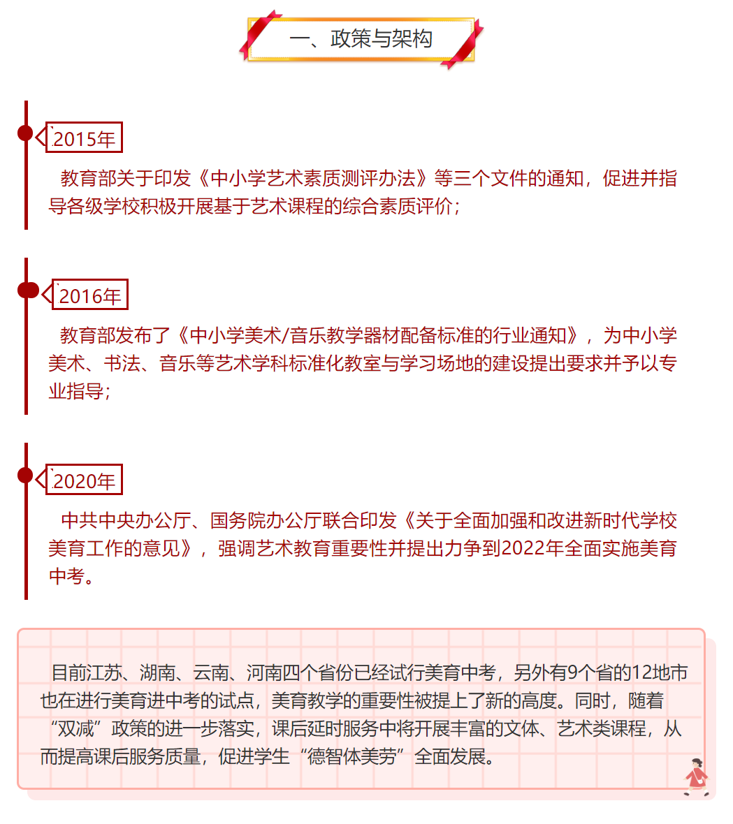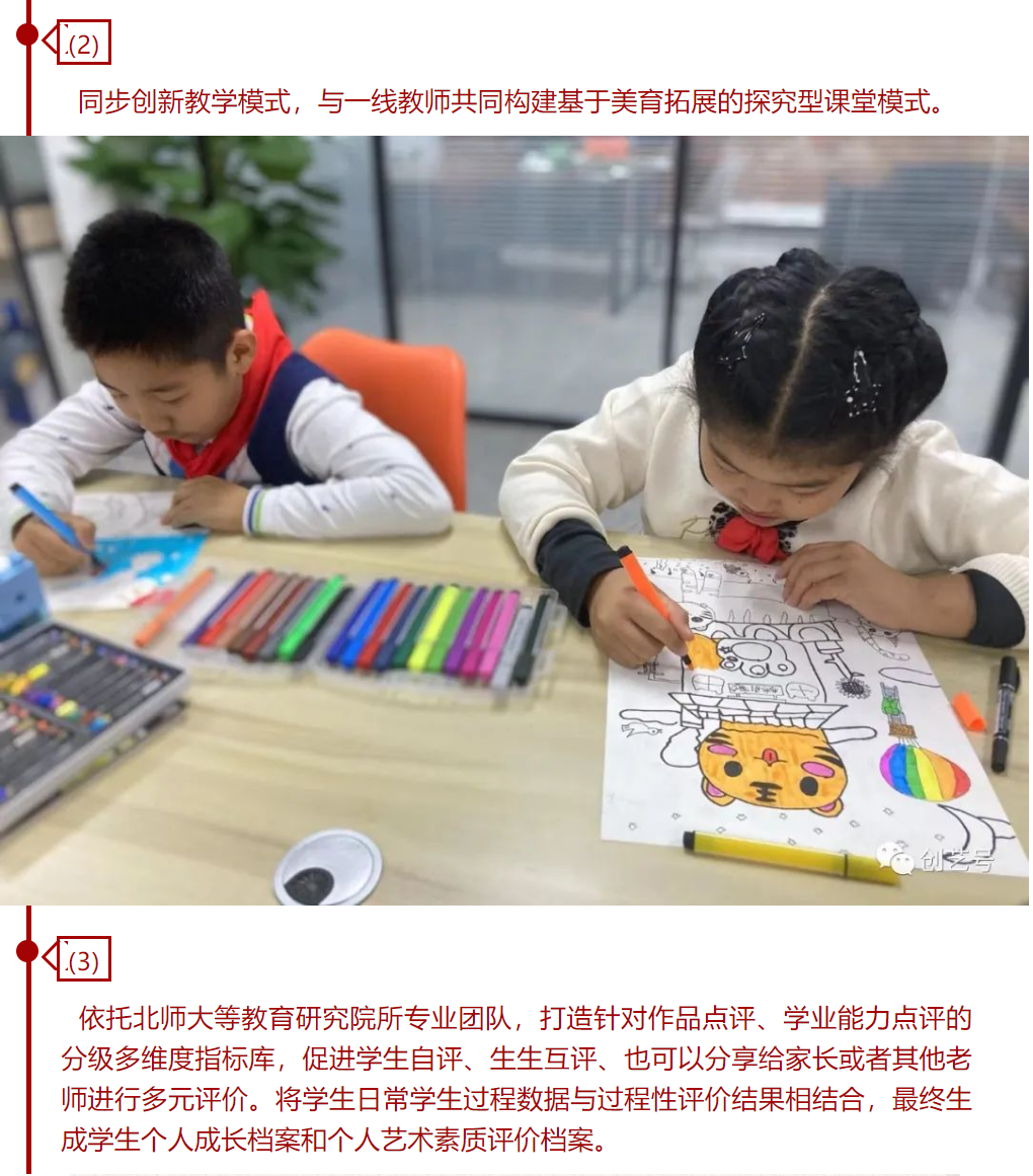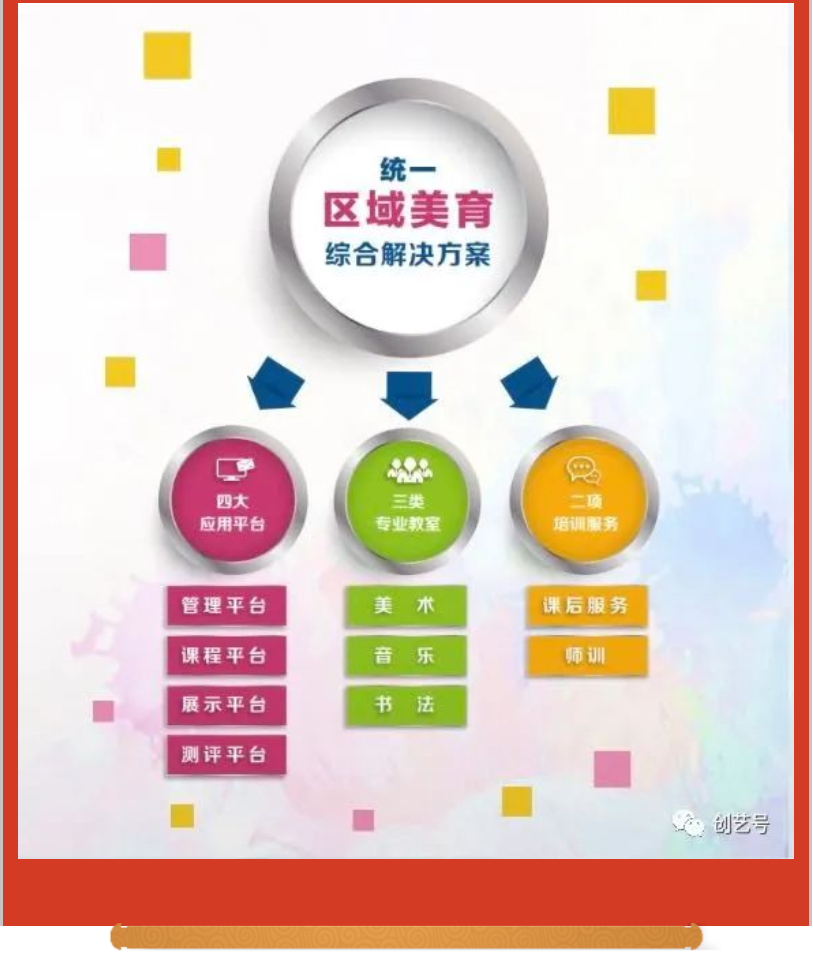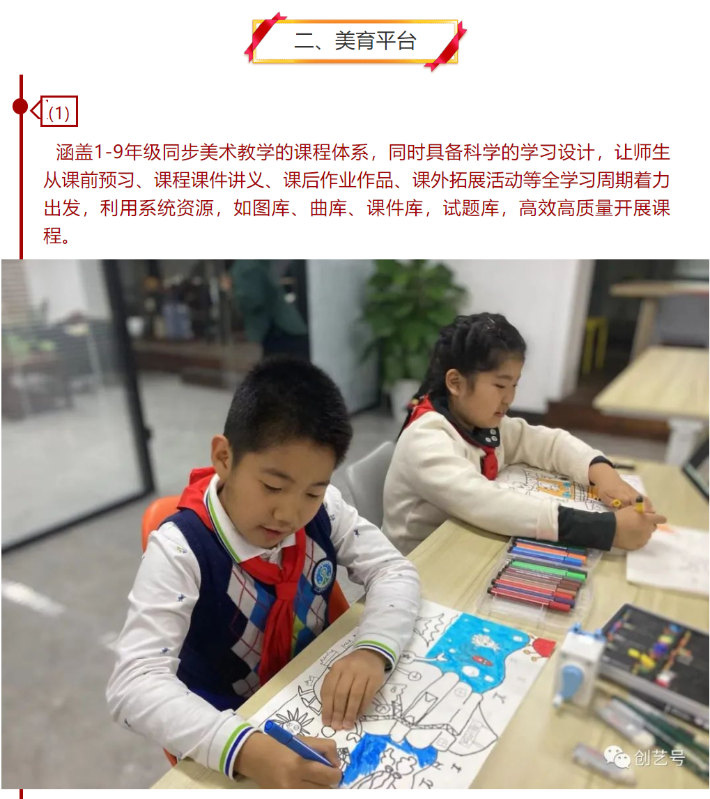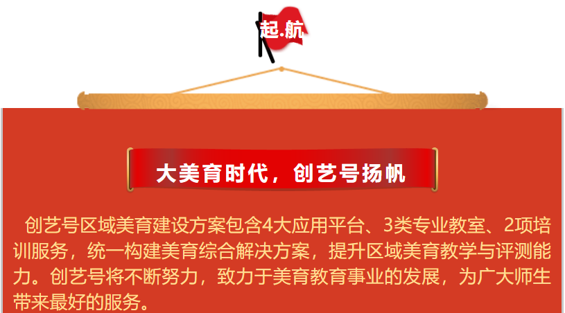 | 區(qū)域美育整體解決方案。創(chuàng)藝號美育綜合建設方案,做到“三建設,三提升”,建設美育創(chuàng)新型課程模式,提升區(qū)域整體教學能力;建設美育發(fā)展性評價體系,提升學生藝術(shù)綜合素養(yǎng);建設美育專業(yè)化場地課程,提升學校優(yōu)質(zhì)特色發(fā)展,有效服務美育進校園、進中考。 |