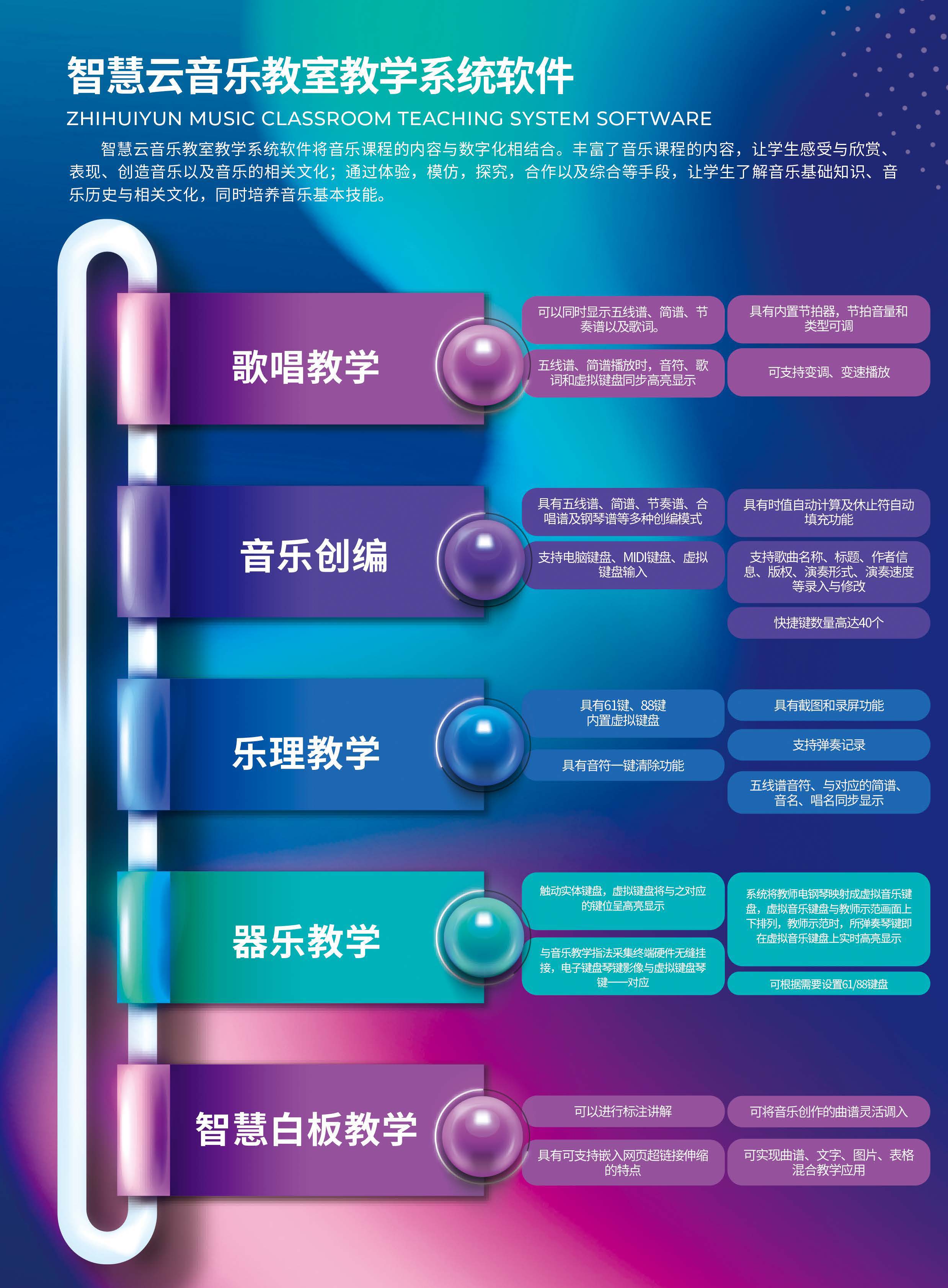 含歌唱系統(tǒng)、音樂編創(chuàng)、樂理教學(xué)、器樂教學(xué)與素質(zhì)測評等多種功能于一體,是滿足學(xué)校數(shù)字音樂教學(xué)、藝術(shù)素質(zhì)測評、提升學(xué)生綜合音樂素養(yǎng)等多方面要求和應(yīng)對新時代教育挑戰(zhàn)的創(chuàng)新之舉。