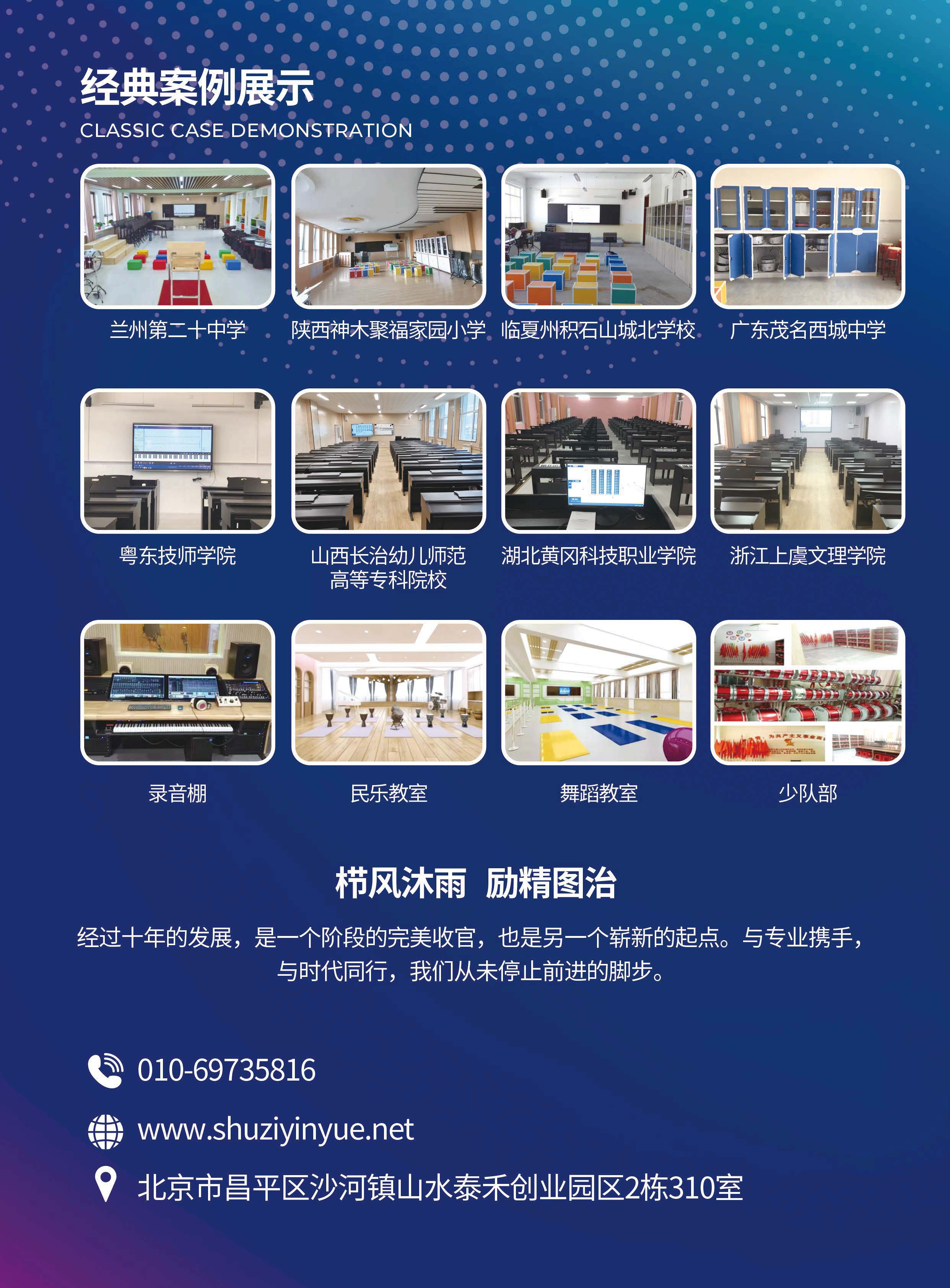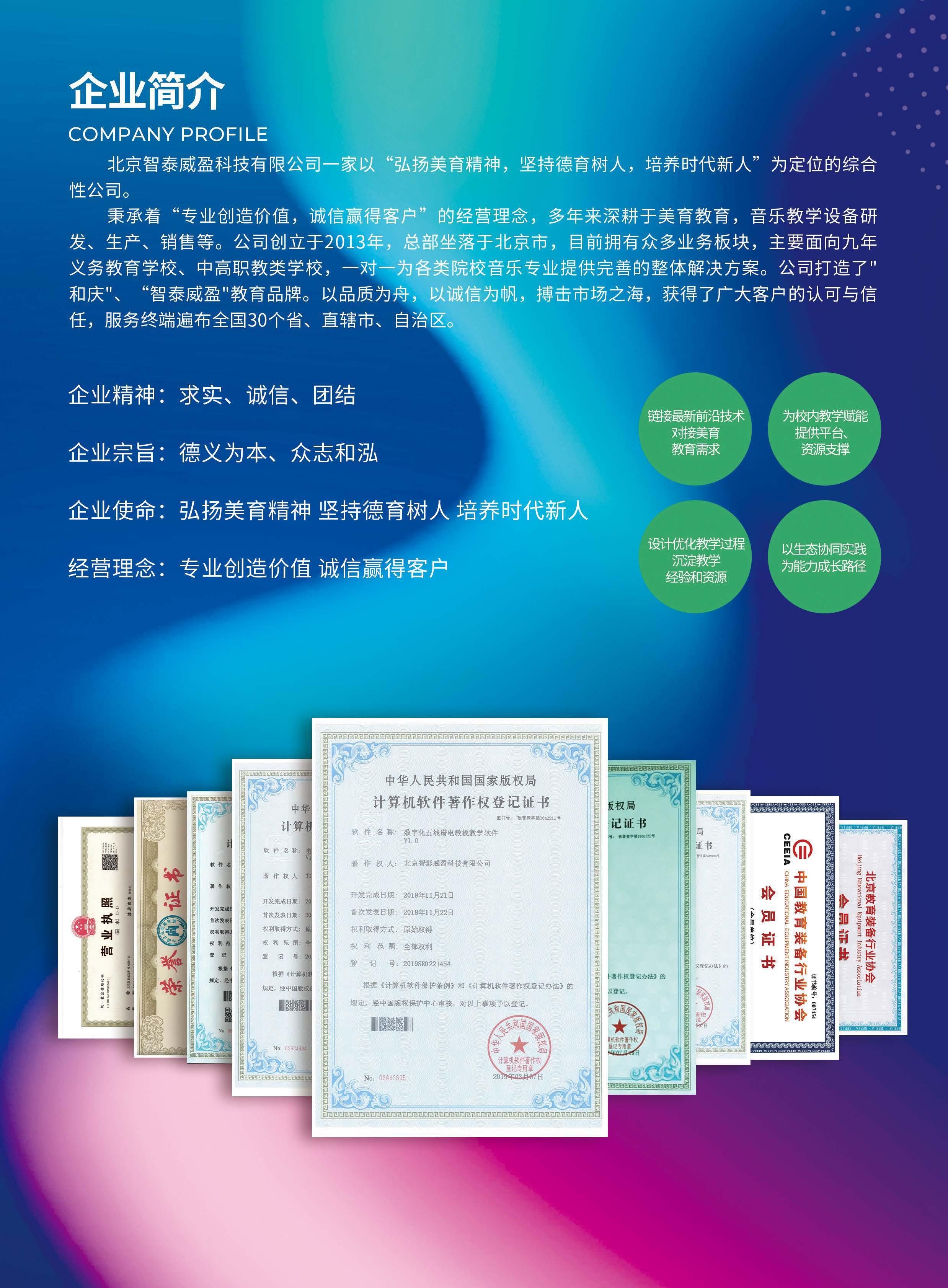 秉承著“專業(yè)創(chuàng)造價值,誠信贏得客戶”的經(jīng)營理念,多年來深耕于美育教育,音樂教學(xué)設(shè)備研發(fā)、生產(chǎn)、銷售等。公司創(chuàng)立于2013年,總部坐落于北京市,目前擁有眾多業(yè)務(wù)板塊,主要面向九年義務(wù)教育學(xué)校、中高職教類學(xué)校,一對一為各類院校音樂專業(yè)提供完善的整體解決方案。公司打造了"和慶"、“智泰威盈"教育品牌。以品質(zhì)為舟,以誠信為帆,搏擊市場之海,獲得了廣大客戶的認可與信任,服務(wù)終端遍布全國30個省、直轄市、自治區(qū)。櫛風(fēng)沐雨,勵精圖治,經(jīng)過十年的發(fā)展,是一個階段的完美收官,也是另一個嶄新的起點。與專業(yè)攜手,與時代同行,我們從未停止前進的腳步。