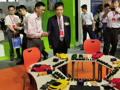 開幕式后,中國教育裝備行業(yè)協(xié)會會長王富會長蒞臨互動展區(qū)鈦創(chuàng)星公司參觀指導,觀看了智能沙盤的互動演示以及鈦邁羅的組裝部件:“能把編程和動手實踐結合,做到人工智能教育的方案落地,說明公司真的在思考在干實事!”