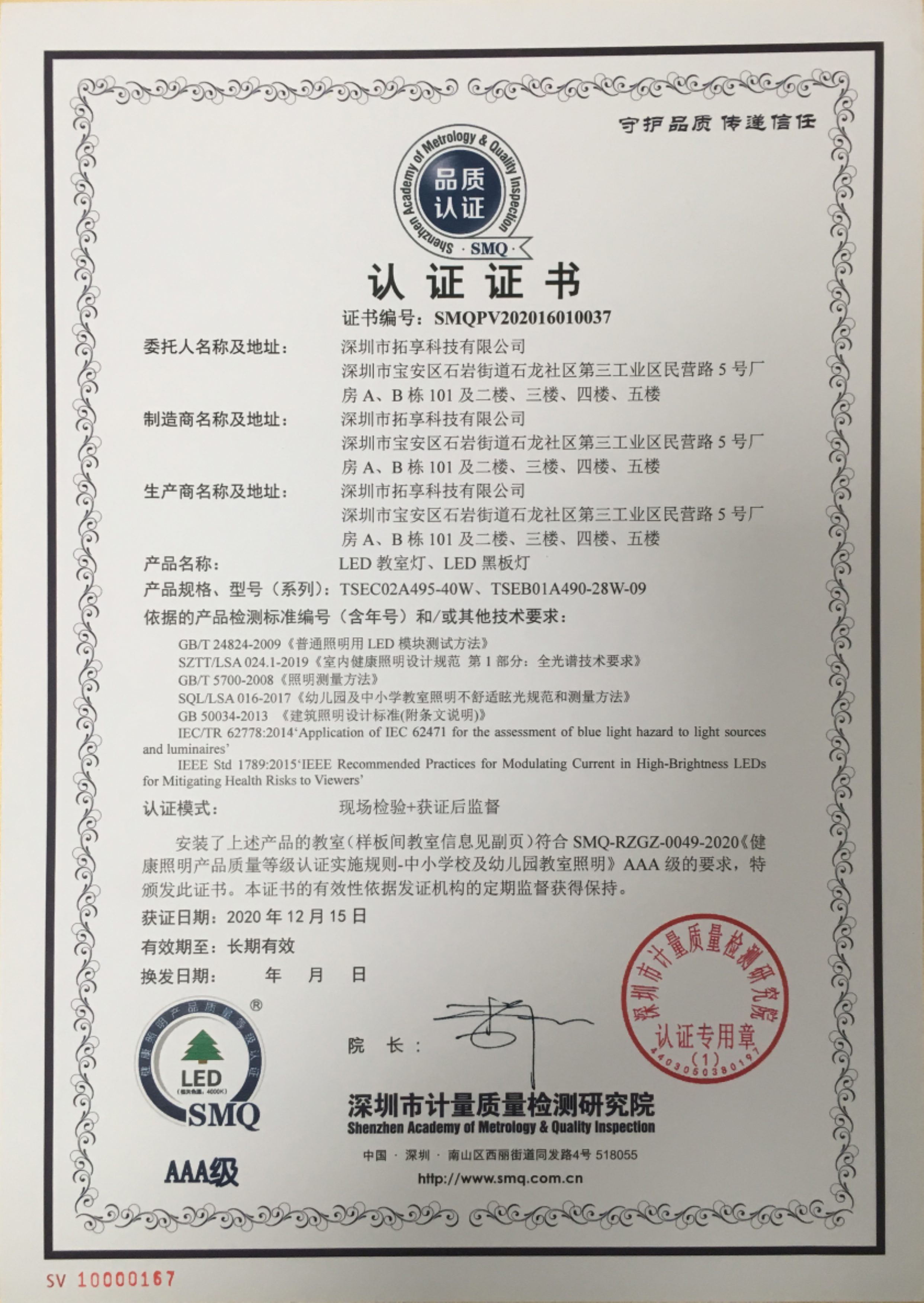 2020年10月,針對(duì)深圳市最新出臺(tái)的全光譜教室照明標(biāo)準(zhǔn),雷曼拓享配合深圳市計(jì)量院,選用最新研創(chuàng)的“全光譜護(hù)眼教室燈+全光譜護(hù)眼黑板燈”,在深圳市寶安孝德學(xué)校搭建的樣板間,成為市面上首個(gè)符合標(biāo)準(zhǔn)的AAA級(jí)示范樣板。