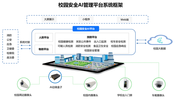 校園安全AI安全平臺基于實際的校園安全場景,構建基于物聯(lián)網、大數(shù)據(jù)和人工智能等新技術的AI管理平臺,為校園安全的日常管理工作提供智能化支撐。