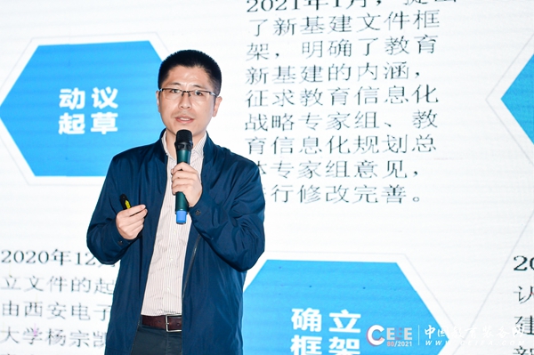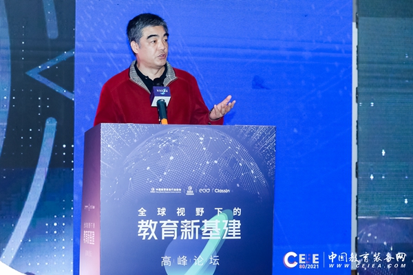 任昌山在會上對“教育新基建”政策進行了全面解讀。他認為,教育新基建的“新”主要體現(xiàn)在三個方面:第一,新內(nèi)涵。新基建是相對傳統(tǒng)基建而言的,傳統(tǒng)基建大多指建筑工程,新基建以信息網(wǎng)絡(luò)為基礎(chǔ),根據(jù)國家發(fā)改委的表述,可分為信息技術(shù)設(shè)施,融合基礎(chǔ)設(shè)施和創(chuàng)新基礎(chǔ)設(shè)施三類。第二,新技術(shù)。教育新基建是對教育信息化現(xiàn)有發(fā)展基礎(chǔ)的傳承和創(chuàng)新,要更加注重新一代信息技術(shù)的廣泛應(yīng)用。支撐以5G、人工智能、云計算、區(qū)塊鏈等為代表的新一代信息技術(shù)與教育教學(xué)實踐深度融合,培育教育信息化發(fā)展的新動能。第三,新機制。推動教育新基建,要充分發(fā)揮各方力量,構(gòu)建多方協(xié)同的教育供給新生態(tài),加強部際協(xié)同、部省聯(lián)動和區(qū)域協(xié)調(diào),促進算力資源、教育數(shù)據(jù)、教育應(yīng)用的開放共享,實現(xiàn)集約部署和高效利用。