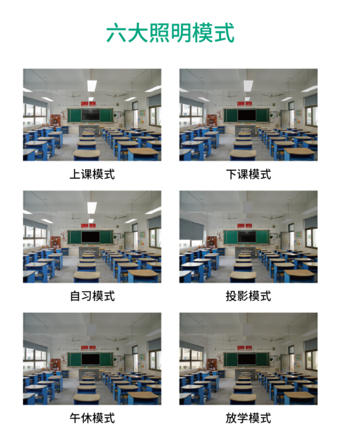 教室照明具有高照度、無眩光、無藍(lán)光、無可視頻閃和低UGR等要求,宜美照明以卓越的設(shè)計(jì)和選材,以及恒照度智能控光技術(shù),提供六大照明模式,可為標(biāo)準(zhǔn)教室照明提供一系列解決方案。
