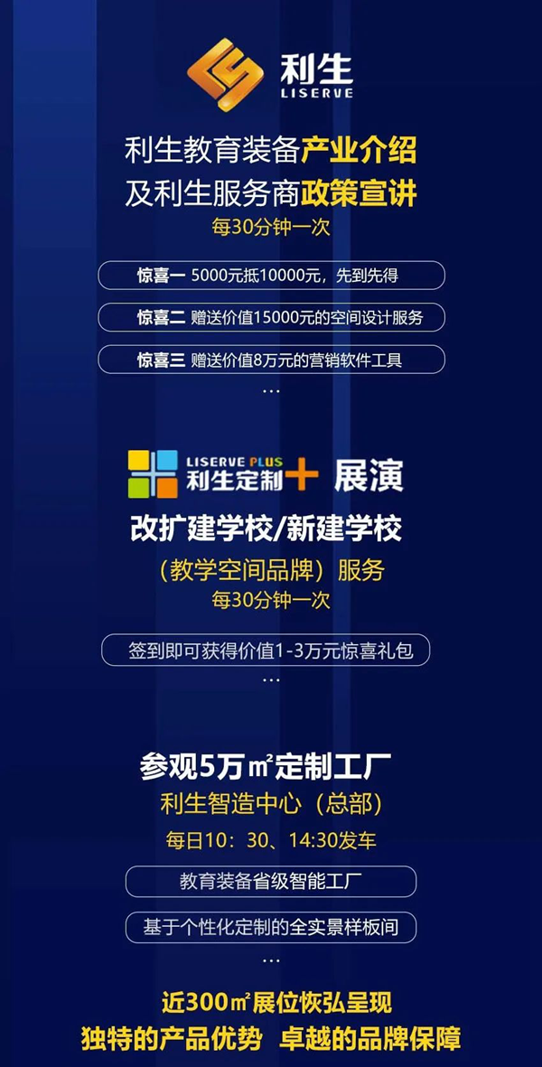 利生公司高度重視此次博覽會(huì)的舉辦,攜學(xué)科教室綜合解決方案、教學(xué)空間綜合解決方案教育照明綜合解決方案、空間快速規(guī)劃與裝備指導(dǎo)系統(tǒng)、教學(xué)儀器設(shè)備綜合解決方案、政采電商平臺(tái)服務(wù)等六大系列教裝產(chǎn)品及最新創(chuàng)新成果亮相此次博覽會(huì),經(jīng)過(guò)前期精心籌備,在近300㎡的F002展位閃耀登場(chǎng)!