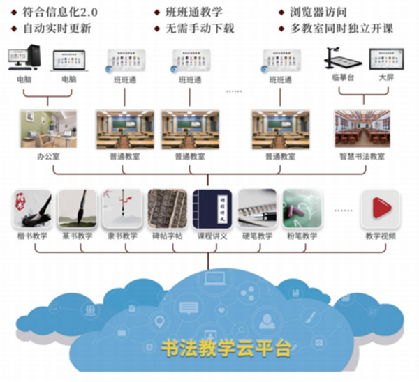 針對(duì)書法學(xué)科特點(diǎn),基于智慧教室模型,提供書法教學(xué)工作中所需的三十余種子軟件系統(tǒng)。既有完善的授課系統(tǒng),豐富的教學(xué)資源,還有便捷高效的輔助教學(xué)工具軟件,從課堂管理到筆洗控制系統(tǒng),從備課系統(tǒng)到作業(yè)一鍵采集,從直播示范到互動(dòng)視頻教學(xué),滿足老師各方面需求的同時(shí),支持開放式個(gè)性化服務(wù)。