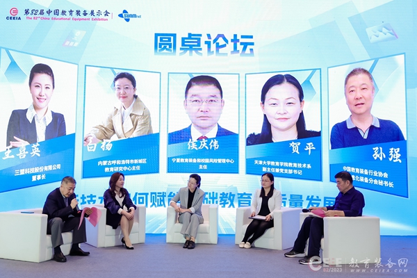 會議最后舉行了圓桌論壇環(huán)節(jié),寧夏教育裝備和校園風(fēng)險管理中心主任侯慶偉、天津大學(xué)教育學(xué)院教育技術(shù)系副主任兼黨支部書記賀平、內(nèi)蒙古呼和浩特市新城區(qū)教育研究中心主任白楊、三盟科技股份有限公司董事長王喜英、中國教育裝備行業(yè)協(xié)會教育信息化裝備分會秘書長孫強圍繞新技術(shù)如何賦能基礎(chǔ)教育高質(zhì)量發(fā)展的主題展開討論。