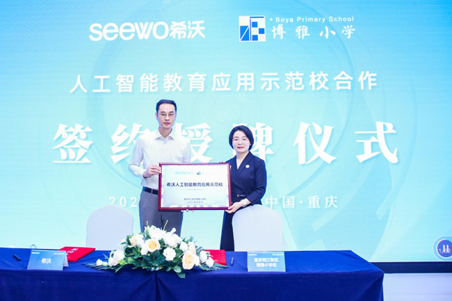 當(dāng)“未來一節(jié)課”走進(jìn)真實(shí)課堂,會(huì)發(fā)生什么變化?在展會(huì)現(xiàn)場(chǎng),希沃與重慶兩江新區(qū)博雅小學(xué)校進(jìn)行了人工智能教育應(yīng)用示范校合作簽約,助力人工智能與教育數(shù)字化深度融合,推動(dòng)以智助學(xué)、以智助教、以智助管和以智助研。同期,副校長(zhǎng)林曉宇從學(xué)校實(shí)際出發(fā),作《學(xué)以致廣,行以致雅:AI數(shù)字孿生課堂,構(gòu)建博雅教師發(fā)展新生態(tài)》分享,并表示:“希沃課堂智能反饋系統(tǒng)在學(xué)校已經(jīng)常態(tài)化應(yīng)用,能夠讓學(xué)生的數(shù)據(jù)‘會(huì)說話’,讓聽評(píng)課‘回到現(xiàn)場(chǎng)’,幫助學(xué)校實(shí)現(xiàn)真正的智慧教育。”
