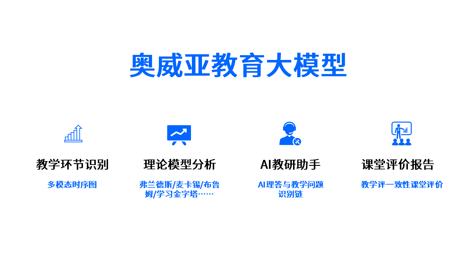 聚焦“數(shù)字化賦能教師發(fā)展成為常態(tài)”的目標(biāo),奧威亞全新推出“教育多模態(tài)分析模型”,通過構(gòu)建線下智慧教學(xué)空間與線上教師發(fā)展智慧平臺,以AI技術(shù)為支撐,以多模態(tài)課堂數(shù)據(jù)為基礎(chǔ),以“AI教研助手”互動應(yīng)用為載體,通過AI循證教研賦能青年教師教學(xué)能力提升,以及AI智能測評賦能教師隊伍專業(yè)發(fā)展,從而推動高素質(zhì)專業(yè)化教師隊伍建設(shè),持續(xù)鞏固“雙減”成果,全面提升課堂教學(xué)水平。