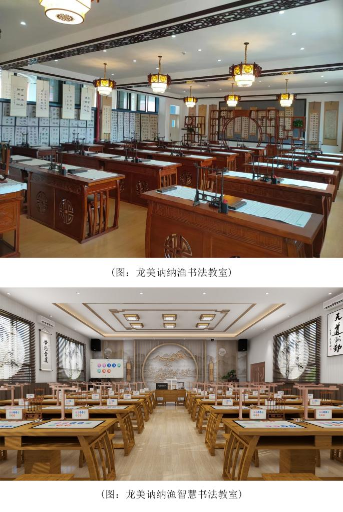龍美訥納漁書法教室是在完整保留傳統(tǒng)書法學(xué)習(xí)功能的基礎(chǔ)上,以書法基礎(chǔ)練習(xí)為核心,教師和學(xué)生均配備有榫卯結(jié)構(gòu)純實(shí)木古典書法桌,毛筆、筆擱、筆洗、鎮(zhèn)尺、硯臺(tái)、宣紙、毛氈等書法用具,打造高標(biāo)準(zhǔn)專業(yè)書法教室,可滿足各學(xué)段書法課程的授課與學(xué)習(xí)。且對(duì)書法教室空間進(jìn)行了精心設(shè)計(jì)布局和裝飾,營(yíng)造出濃厚的書法藝術(shù)氛圍。讓學(xué)生在學(xué)習(xí)過(guò)程中自然而然地沉浸其中,感受書法的獨(dú)特魅力。