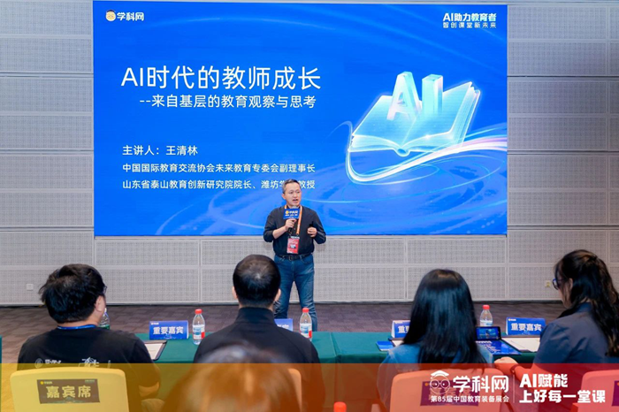 正高級研究員、國家級教學(xué)成果獎一等獎獲得者、山東省泰山教育創(chuàng)新研究院院長王清林以《AI時代的教師成長》為主題,進(jìn)行了現(xiàn)場分享。王清林表示,教育的本質(zhì)是教人學(xué)會思考,在人工智能背景下,陳舊的教學(xué)方式與學(xué)生真實需求之間的矛盾將會加劇,學(xué)生思辨力的提升對教學(xué)提出了更高要求。教師正成為這場教育變革的最大推動者,AI時代教師可以培養(yǎng)六大素養(yǎng),包括人機(jī)協(xié)作力、數(shù)據(jù)洞察力、情感計算力、創(chuàng)新設(shè)計力、倫理判斷力以及終生進(jìn)化力。人工智能工具的普及使得教育資源均衡化發(fā)展,普通學(xué)校迎來發(fā)展機(jī)遇,任何一所學(xué)校都可以憑借特色課程脫穎而出。