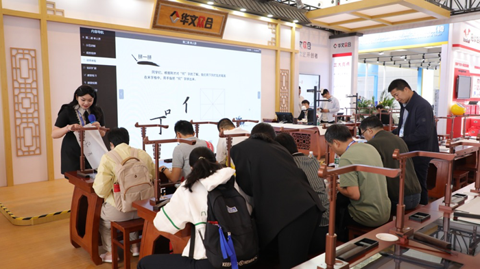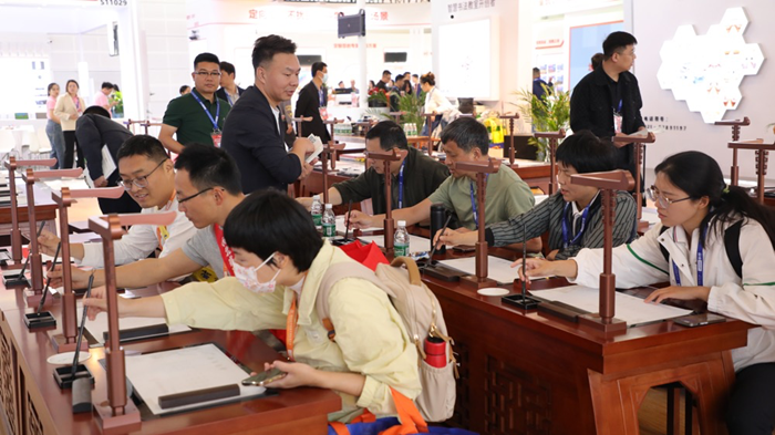 觀眾對華文眾合智慧書法充滿好奇與熱情,紛紛前來體驗(yàn),F(xiàn)場書寫,AI 即時生成專業(yè)測評,感受智慧書法教學(xué)的魅力。