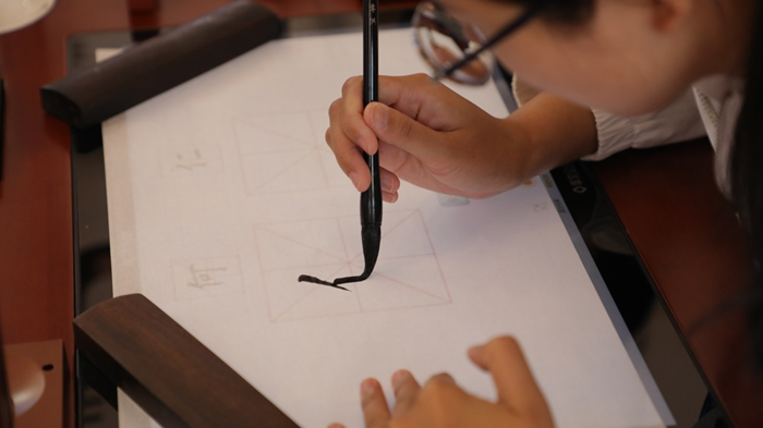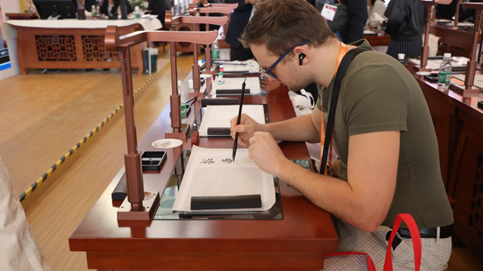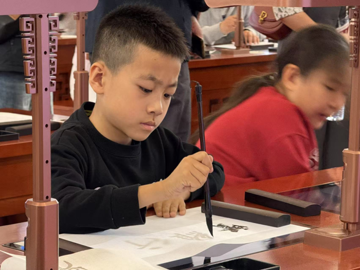 小朋友和外國友人也被吸引過來體驗(yàn)智慧書法,傳統(tǒng)文化的種子不僅在孩子們心中悄悄萌芽,也通過外國友人散播到世界各地。