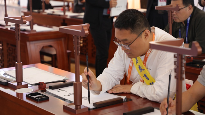 教育部關(guān)心下一代工作委員會常務(wù)副主任王富現(xiàn)場背誦《蘭亭序》全文,觀眾云集,掌聲雷動,將展會氛圍推向高潮。