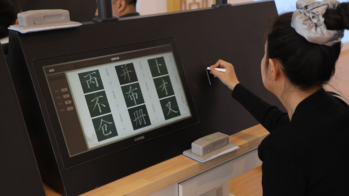 不少觀眾沉浸式體驗(yàn)智慧粉筆臨摹臺。