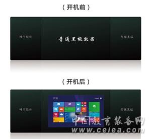 當(dāng)打開電源時,中間一塊顯示出液晶的顯示畫面,可以進(jìn)行觸摸互動,而關(guān)掉時,顯示畫面隱形,又顯示為一個普通黑板的表象,在上面進(jìn)行書寫。