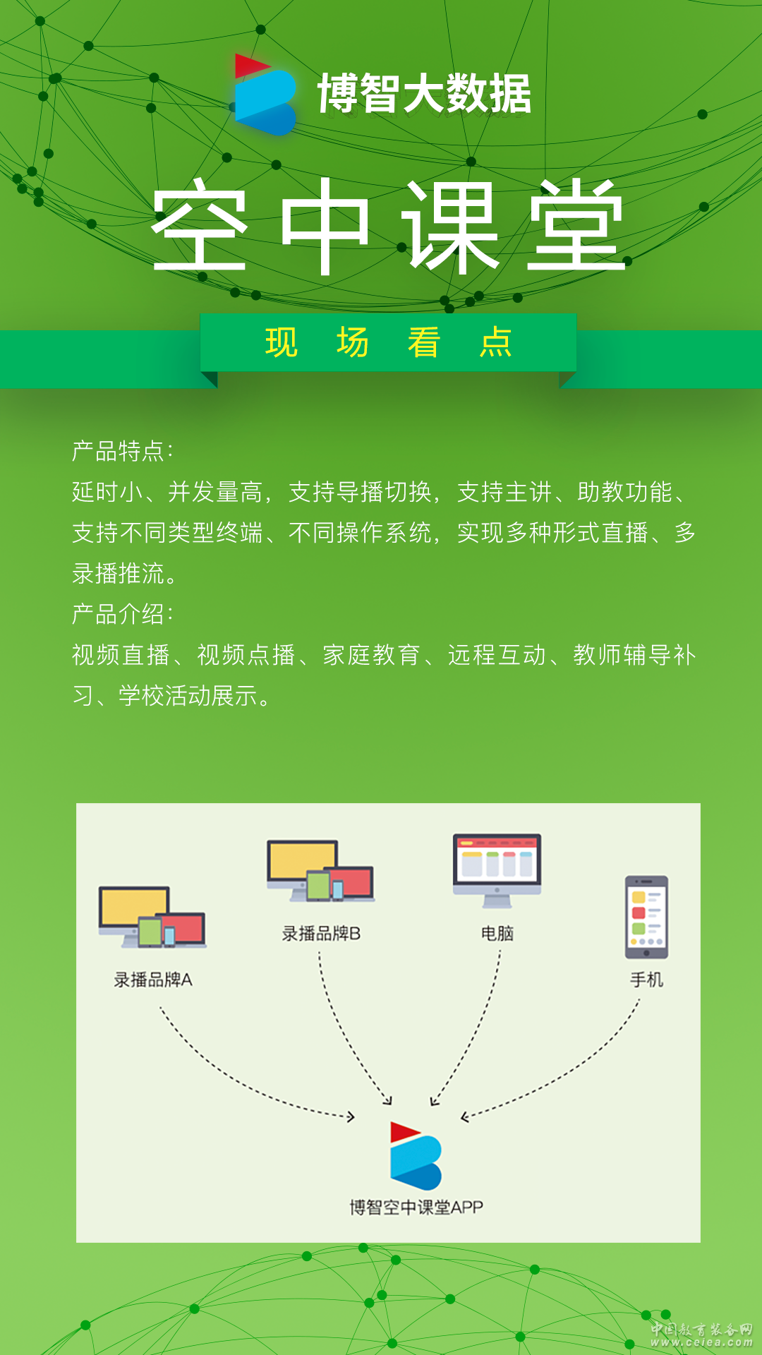 產(chǎn)品詳細(xì)介紹博智空中課堂通過(guò)rtmp標(biāo)準(zhǔn)協(xié)議,實(shí)現(xiàn)多錄播推流,支持視頻資源目錄自定義、客戶端支持局域網(wǎng)大規(guī)模直播無(wú)延遲、支持8錄視頻通過(guò)軟件導(dǎo)播切換,支持主講、助教功能。可以通過(guò)手機(jī)、電腦、攝像頭直播推流、實(shí)現(xiàn)多種形式直播。 產(chǎn)品特點(diǎn): 延時(shí)小、并發(fā)量高,支持導(dǎo)播切換,支持主講、助教功能、支持不同類型終端、不同操作系統(tǒng),實(shí)現(xiàn)多種形式直播、多錄播推流。