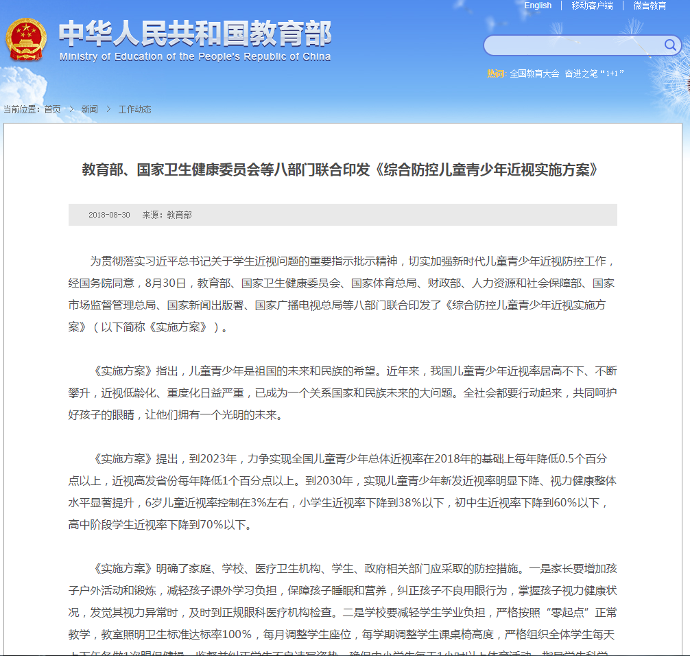 近年來,由于中小學生課內(nèi)外負擔加重,智能手機、平板電腦等電子產(chǎn)品普及,用眼過度、用眼不衛(wèi)生、缺乏體育鍛煉和戶外活動,社會上對兒童青少年近視防控工作和視力健康管理認識不足,公眾視覺健康知識匱乏和視覺健康領域政策保障薄弱,各部門協(xié)同配合不夠等因素,我國兒童青少年近視問題越發(fā)嚴重,近視率居高不下、不斷攀升且呈現(xiàn)低齡化、重度化、發(fā)展快、程度深的趨勢。2014年全國學生體質(zhì)與健康調(diào)研結果顯示,我國各學段學生近視率持續(xù)上升,7―12歲小學生、13―15歲初中生、16―18歲高中生視力不良率分別為45.71%、74.36%、83.28%。2018年6月,國家衛(wèi)生健康委通報,我國兒童青少年近視率已居世界第一。