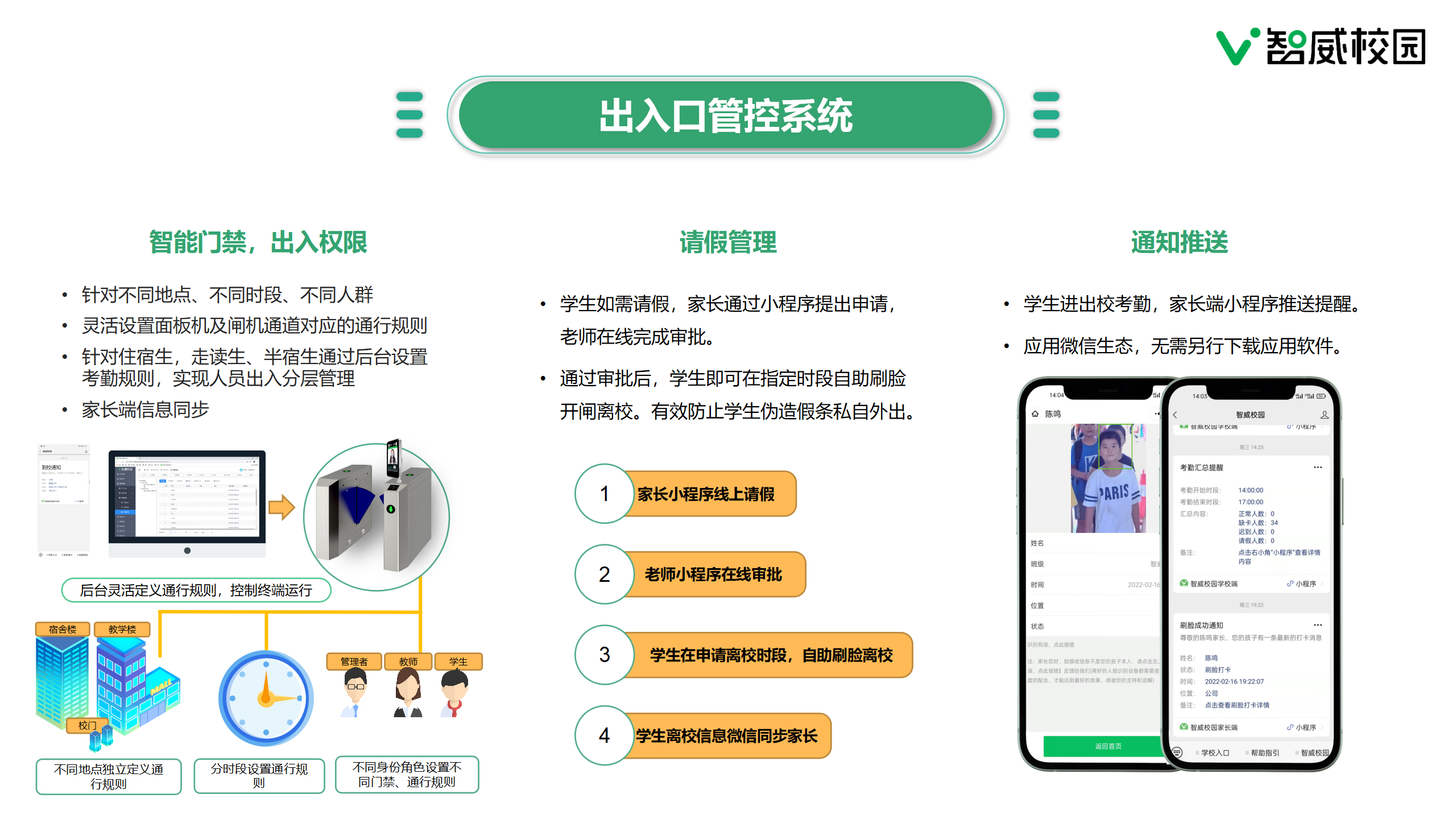 產(chǎn)品詳細(xì)介紹智能門禁,出入權(quán)限 針對(duì)不同地點(diǎn)、不同時(shí)段、不同人群 靈活設(shè)置面板機(jī)及閘機(jī)通道對(duì)應(yīng)的通行規(guī)則 針對(duì)住宿生,走讀生、半宿生通過(guò)后臺(tái)設(shè)置考勤規(guī)則,實(shí)現(xiàn)人員出入分層管理 家長(zhǎng)端信息同步
