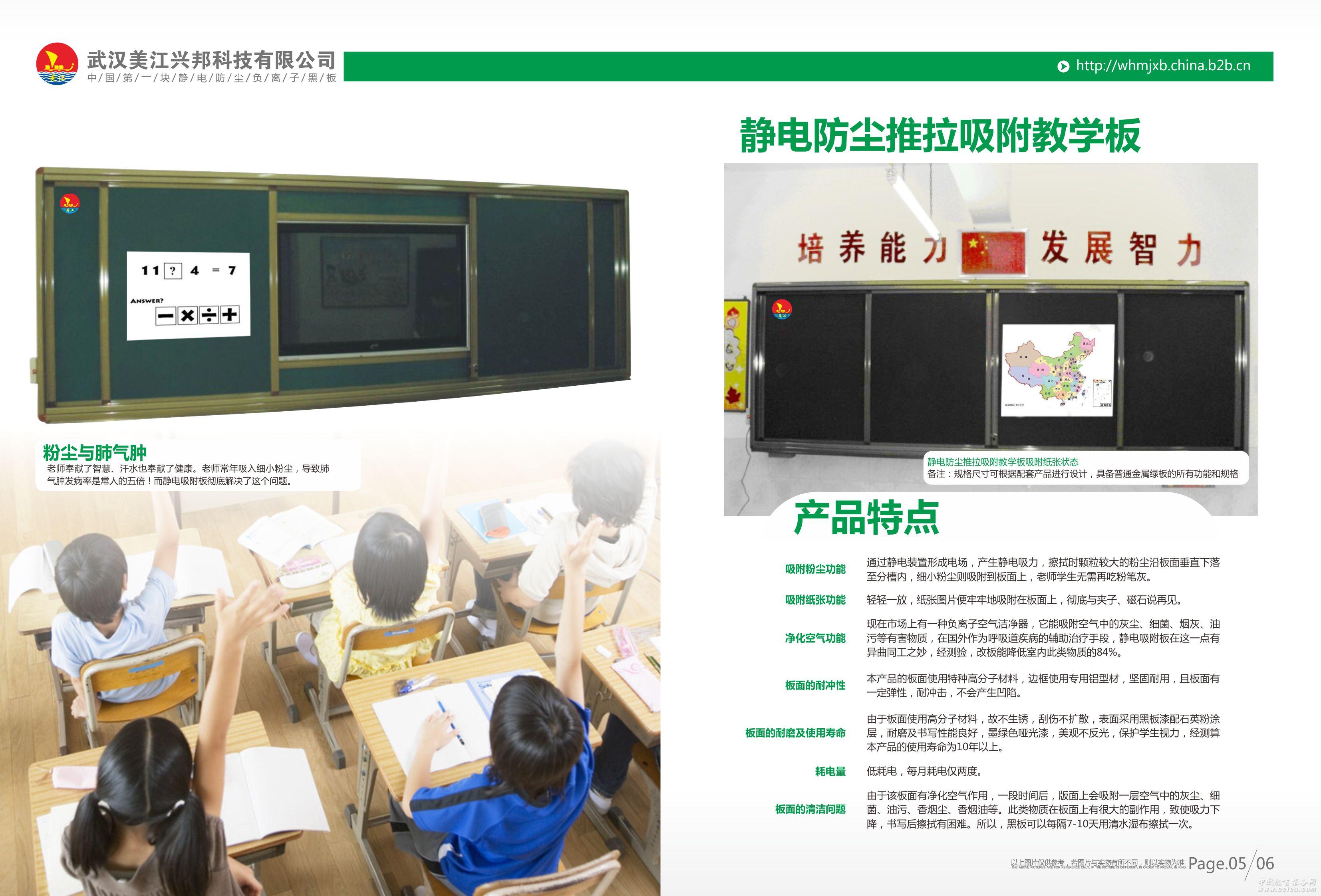 產(chǎn)品詳細介紹 武漢美江興邦科技有限公司,是一家專業(yè)從事教學(xué)產(chǎn)品研發(fā)、生產(chǎn)、銷售、服務(wù)為一體的綜合性科技企業(yè),主要產(chǎn)品有以美江品牌為主的靜電防塵黑板(負離子防塵黑板)、自動吸圖畫板、自動吸圖公告欄、課桌椅、軟包椅等。