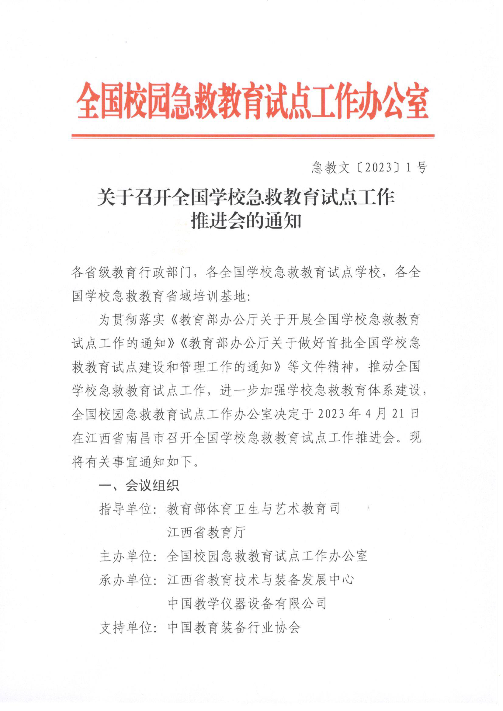 為貫徹落實《教育部辦公廳關于開展全國學校急救教育試點工作的通知》《教育部辦公廳關于做好首批全國學校急救教育試點建設和管理工作的通知》等文件精神,推動全國學校急救教育試點工作,進一步加強學校急救教育體系建設,全國校園急救教育試點工作辦公室決定于2023年4月21日在江西省南昌市召開全國學校急救教育試點工作推進會,F(xiàn)將有關事宜通知如下。